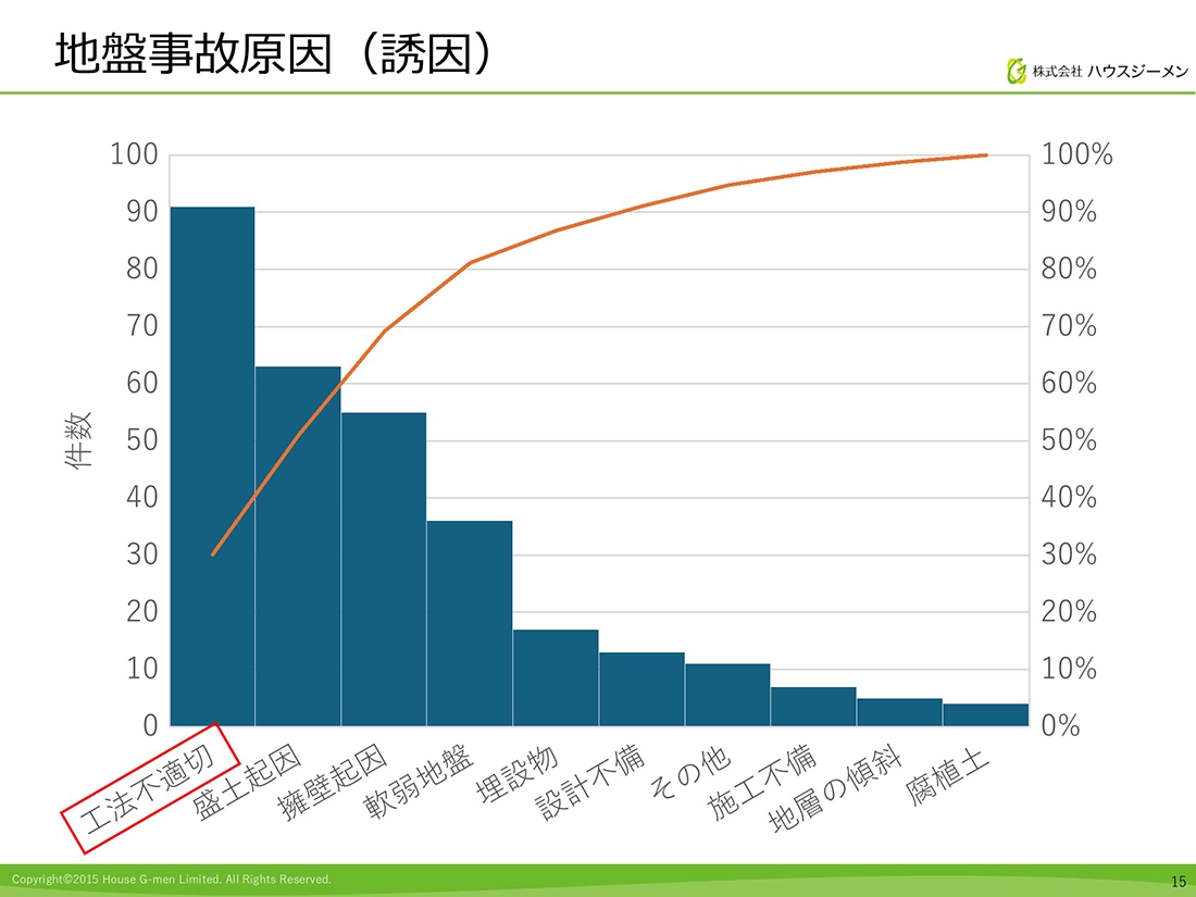 その結果、事故物件のうち46%は何らかの地盤改良工事・対策を行った物件であり、また、約3割の事故が「工法不適切」であったことが明らかになりました。