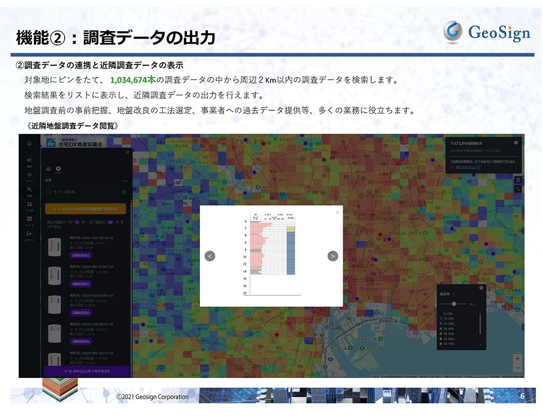 これは、元請けとなる住宅会社自身が利用することも想定されており、「周辺データを探してほしい」という依頼に対して、地盤調査会社を介すことなく営業現場で迅速に対応できるようになります。地盤調査前の事前把握や過去データ提供など、営業・設計における効率化に大きく役立つでしょう。